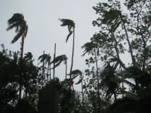 Wir zogen das Boot noch höher auf die Rampe, sicherten Hütte und Grundstück, brachten einige Sachen in unser Steinhaus. Der Himmel wurde immer dunkler, das Meer aufgewühlter und die Palmen bogen sich im zunehmenden Wind. Abends setzte der Regen ein und die ganze Nacht orgelte der Wind um's Haus, ganze Äste und Kokosnüsse krachten auf's Dach bis in die frühen Morgenstunden. Um halb acht morgens liess der Wind sehr schnell nach, aber aus Erfahrung wussten wir, dass das nur eins bedeuten konnte, der Hurrikan war viel näher als vorausgesagt, wir waren im Auge des Sturms und als wir endlich einen Wetterbericht empfangen konnten, bestätigte das unsere Vermutung, das Sturmzentrum zog ganz knapp nördlich von uns vorbei, ein Kategorie 4 Zyklon mit 940 mb im Zentrum.
